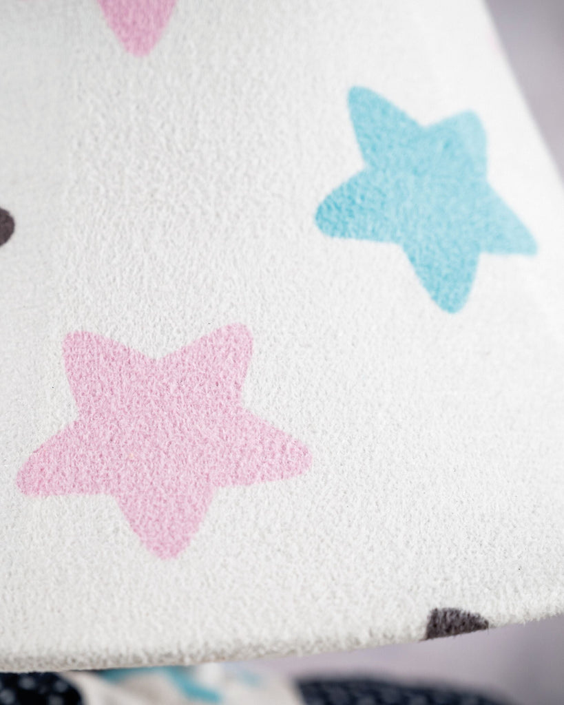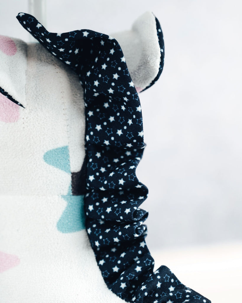 Le corps et l'abat-jour de Finn sont recouverts d'un motif en étoile. Ses oreilles, son museau et sa crinière sont parsemés de bleu foncé et de blanc. Ses yeux mignons sont faits de boutons bleu clair.