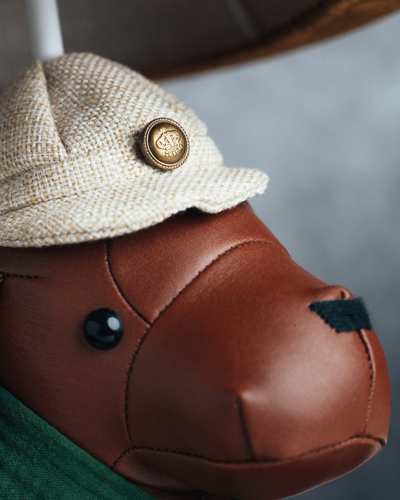 Puisque Spike ne peut pas rester assis, il porte toujours ses outils avec lui sur son côté droit. Il a aussi sa boussole avec lui, pour qu'il soit toujours prêt pour de nouvelles aventures. Sa casquette à bouton doré sans oublier le foulard vert rend son look parfait. Il est fait de cuir d'imitation végétalien de haute qualité dans une couleur marron chic.